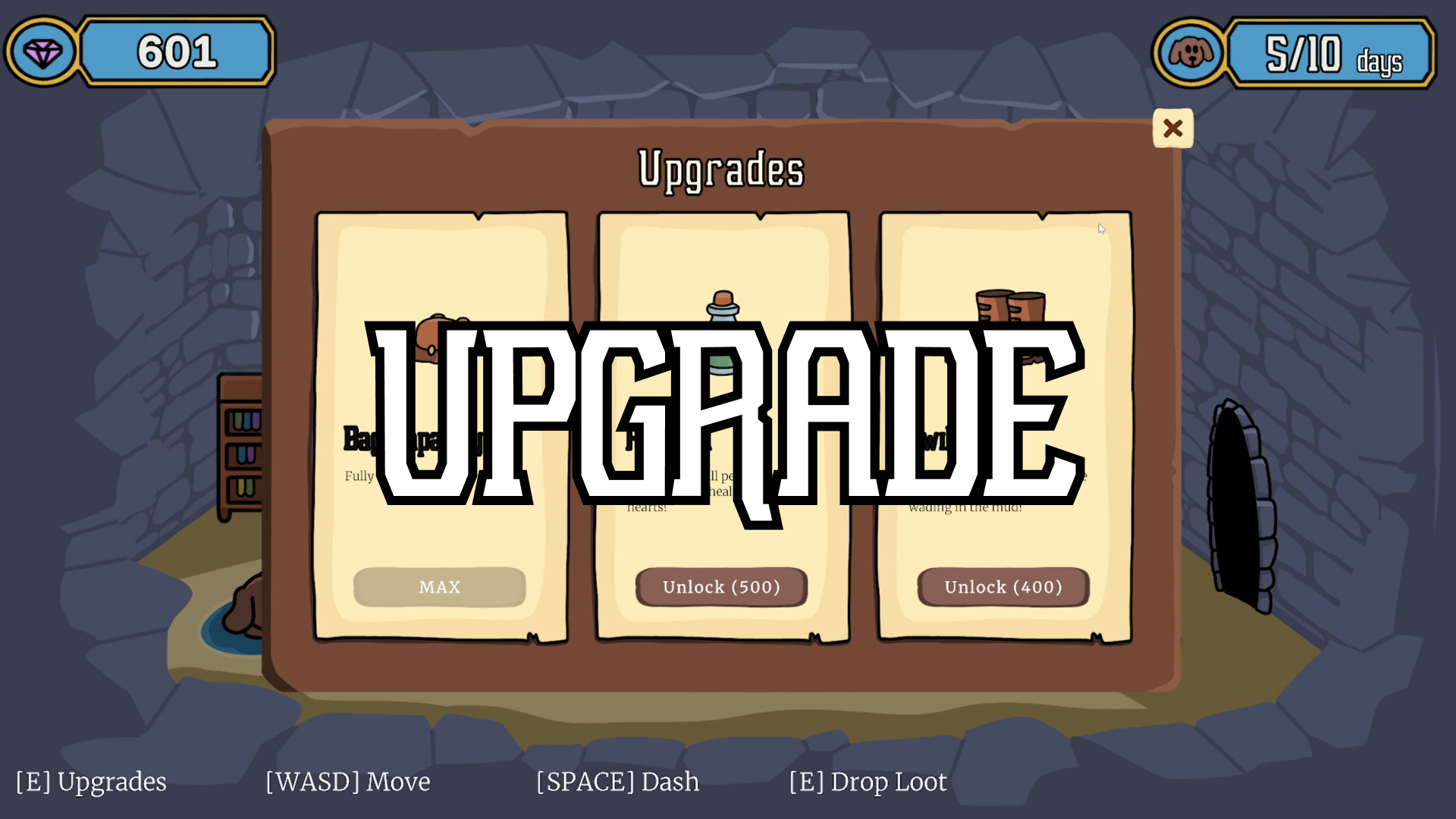 Collect loot each dungeon run and return to base to spend it on upgrades. Grow strong enough to reach the end of the dungeon, grab a potion for your dog, and make it back to base alive!